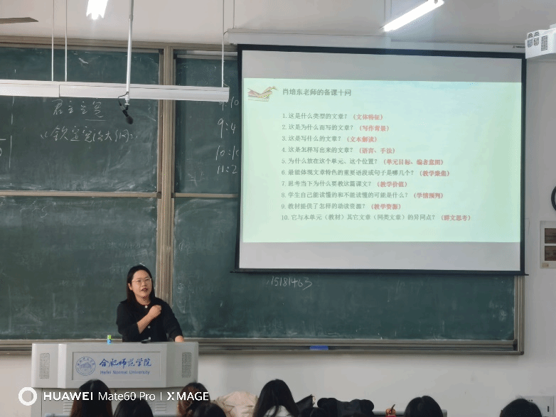 为贯彻师范认证的持续改进理念,推进汉语言文学专业课程建设,12月16日,Bwin必赢网址邀请安徽省教育科学研究院谢发茹老师走进“语文课程与教学论”课堂,为2024级汉语言文学专业师范生讲授“中学语文课堂教学提质路径探索”。