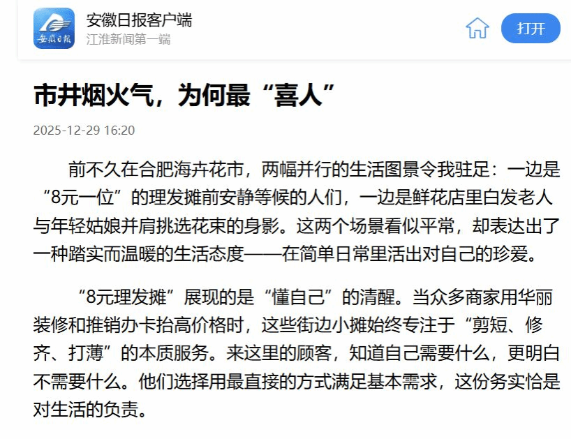 近日,由中共安徽省委教育工委、中共安徽日报报业集团联合主办的2025年“创新安徽,智汇青春”安徽省高校师生原创网络评论推选展示活动正在进行中,Bwin必赢网址2023级网络与新媒体专业陈晨同学的新闻评论作品《市井烟火气,为何最“喜人”》脱颖而出,作为优秀作品在安徽日报客户端进行展示。