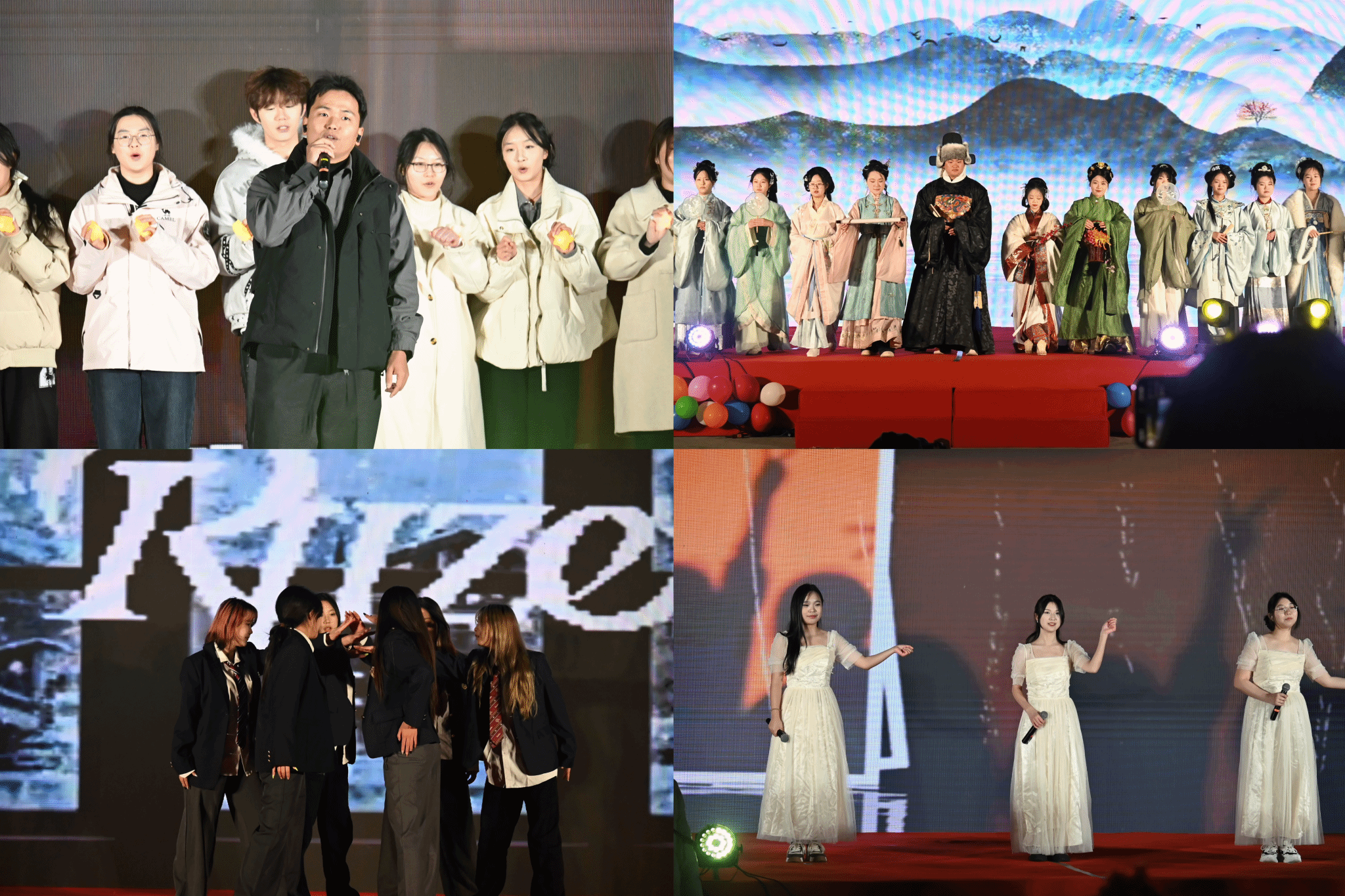 暮色渐浓,灯光璀璨,开场歌曲《一路生花》悠扬响起,元旦晚会正式拉开帷幕。直播镜头流畅切换,将舞台的绚丽光影与观众的热情笑颜实时传递至云端,吸引了大量线上观众点赞互动。三个篇章层层递进,演绎青春风采,传递家国情怀。“新岁序章·青春舞曲”中,乐队表演《鲜花+改变自己》点燃全场热情,鼓点与旋律交织成最鲜活的青春乐章;双人舞蹈《enjoy tonight》舞姿灵动,舞步蹁跹间尽显少年意气;独唱《天后》深情婉转,合唱《不遗憾》温暖治愈。“国风汉韵·民舞京戏”篇章,一场传统文化的视听盛宴徐徐展开。民族舞蹈《阿图什》勾勒出异域风情,舞姿舒展间尽显文化交融之美;汉服走秀《霓裳贺岁》衣袂翻飞,绫罗绸缎间重现华夏礼仪之邦的典雅风韵;《游园惊梦》串烧舞蹈将古典戏曲与现代舞蹈完美融合,一颦一笑、一招一式皆韵味悠长。“烟火星辰·岁岁皆安”篇章,温情与激情交织,定格团圆与希冀。小品《扰民了您》诙谐幽默,以生活化的剧情引发全场共鸣;街舞《love119》活力四射,以动感舞步点燃冬日激情;Bwin必赢网址合唱团带来的《起风了》串烧,旋律悠扬,歌声嘹亮,将晚会氛围推向高潮。