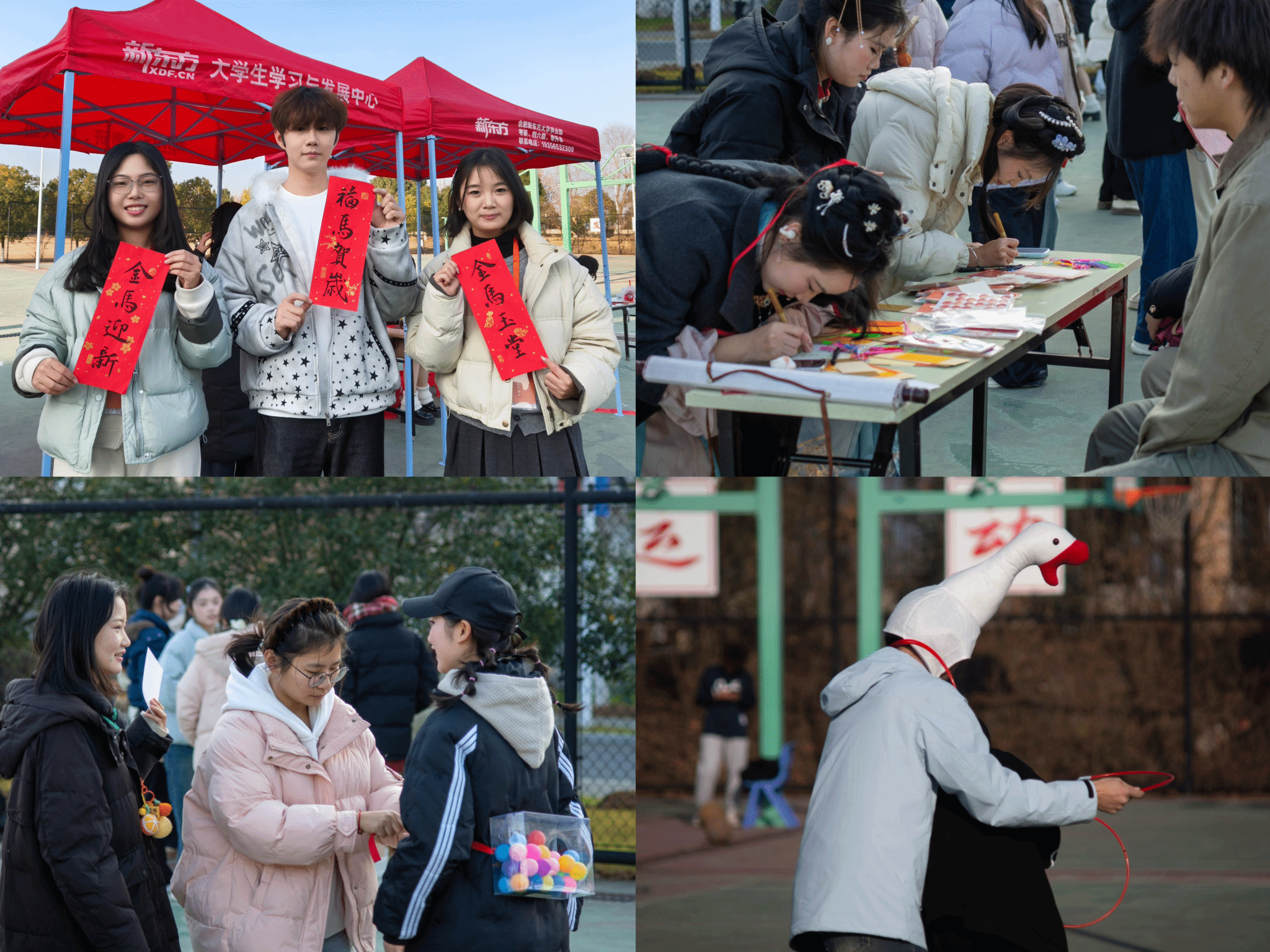 早在晚会开始前,直播的触角已延伸至午后热闹的新春活动集市。28日下午,Bwin必赢网址设置的新春活动集市六大互动区域同步解锁年味狂欢,直播组穿梭其间,多机位记录精彩瞬间,让线上观众亦能“云”逛集市,感受浓浓年味。“迎春纳福·笔底舞龙蛇”专区内,书法特长学子挥毫泼墨,笔走龙蛇间,红底黑字的楹联与精巧别致的书桌小春联新鲜出炉,墨香氤氲中传递着最真挚的新春祝福;“岁启诗签·墨韵迎新春”里,同学们伏案提笔,将对新年的憧憬与期许诉诸笔墨,一张张书签、一枚枚明信片,都成为承载心愿的珍贵信物。成语接龙换套圈的脑力比拼、萌趣套大鹅的团队协作、诗韵转盘的诗词挑战、摇摆闯关的体能较量、憋笑大挑战的趣味互动,让现场欢声笑语不断。这些生动场景通过直播画面实时分享,吸引了众多线上观众互动留言。师生们在沉浸式体验中感受传统文化与趣味游戏的碰撞,收获满满的欢乐与惊喜。