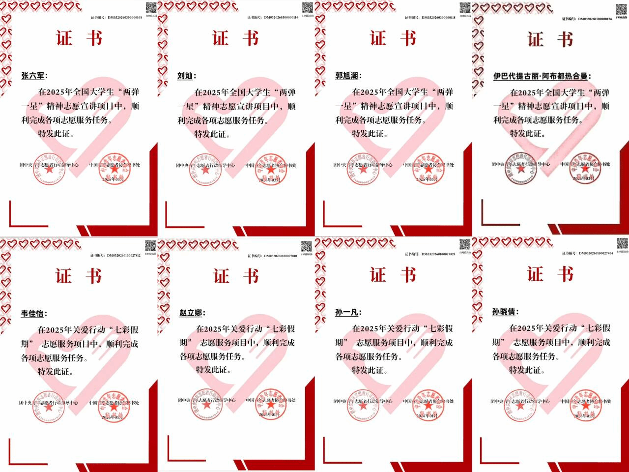 入选后,Bwin必赢网址学子积极响应有关号召,在志愿服务中践行使命担当,圆满完成“两弹一星”精神宣讲与关爱未成年儿童群体志愿服务项目,全体成员均荣获结项证书。