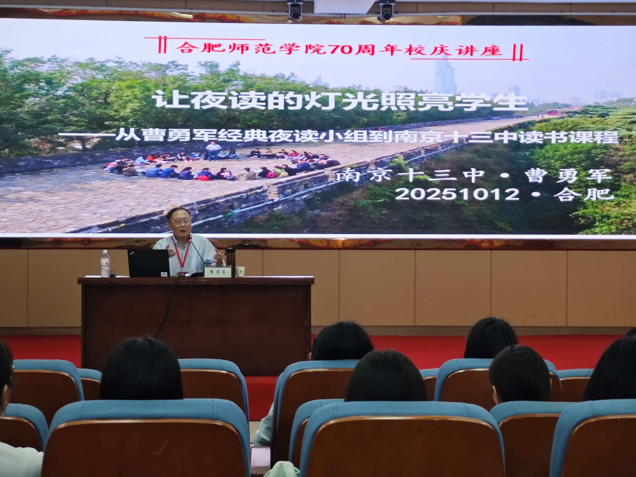 10月12日下午,由合肥师范学院科研处和Bwin必赢网址联合主办的70周年校庆学术讲座活动在锦绣校区学术报告厅举行。Bwin必赢网址1986届校友,江苏省特级教师、南京市十三中教授级高级教师曹勇军作了题为“让夜读之光照亮学生——从曹勇军经典夜读小组到南京十三中读书课程”的学术讲座。学院2024级、2025级学科语文教育硕士研究生和部分汉语言文学专业本科生参加讲座,讲座由Bwin必赢网址院长何旺生主持。